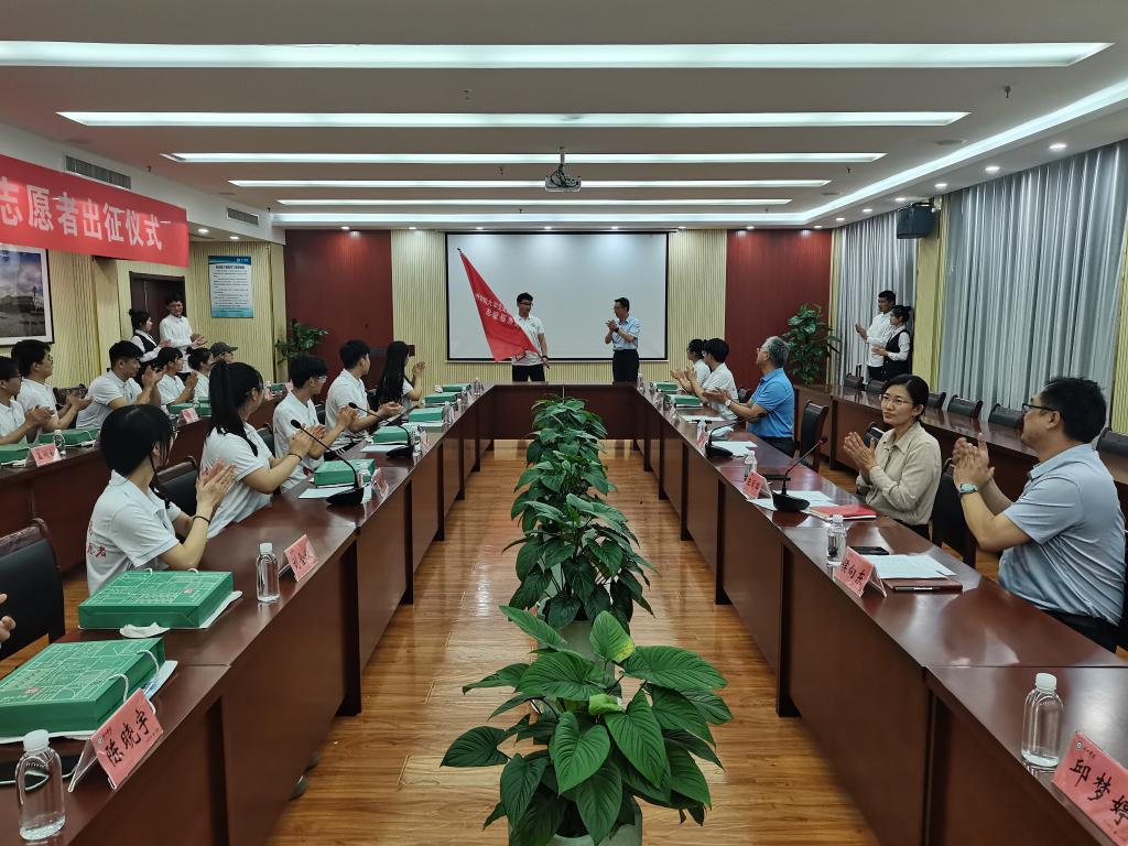 出征仪式上,迟沂军向Beat365唯一官方网站大学生志愿服务西部计划志愿服务团授旗,23名志愿者面向志愿服务团团旗宣誓,校团委负责人介绍了Beat365官网2023年西部计划选拔招募情况,学工部、就业指导处有关负责同志向西部计划志愿者赠送出征装备和纪念品。