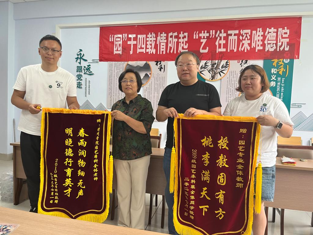 活动中,2013届园艺专业和2014届园艺专业校友代表分别为全体园艺专业教师赠送锦旗感谢恩师教诲、感恩母校培养。班主任老师为每一位返校校友精心准备了校友姓名牌纪念品,校友办老师为校友们分发了校友徽章。校友们纷纷在写有“青春依然 皆‘德’所‘院’”的签名墙上签名留念。
