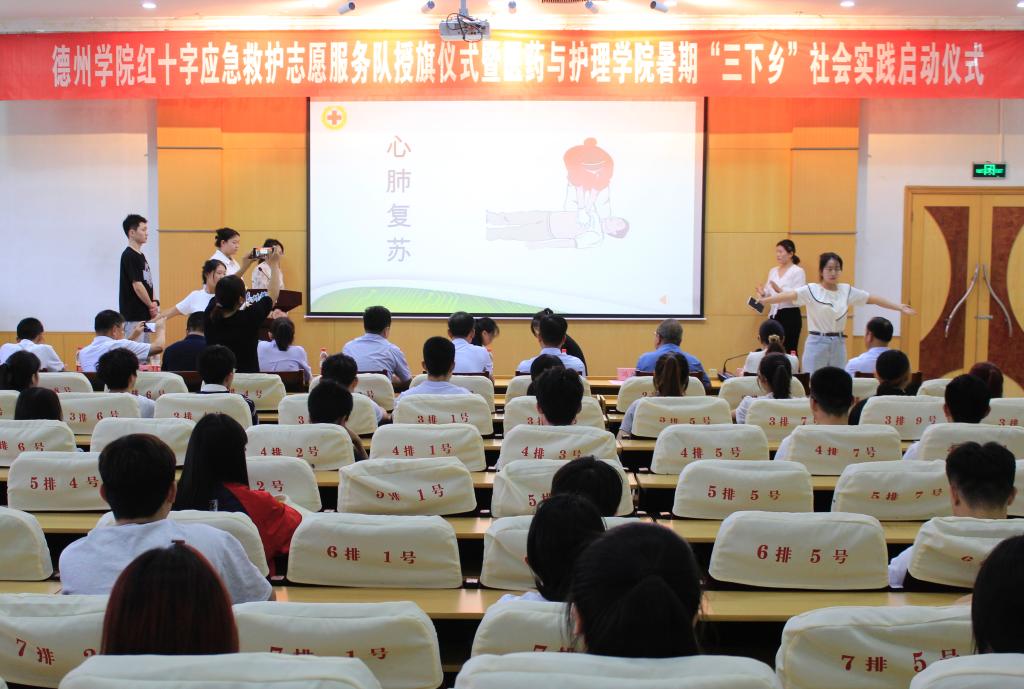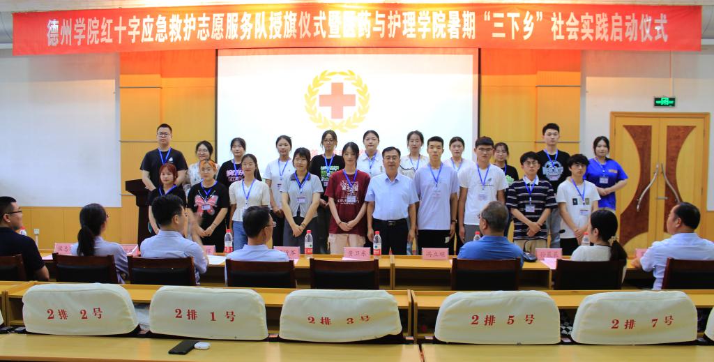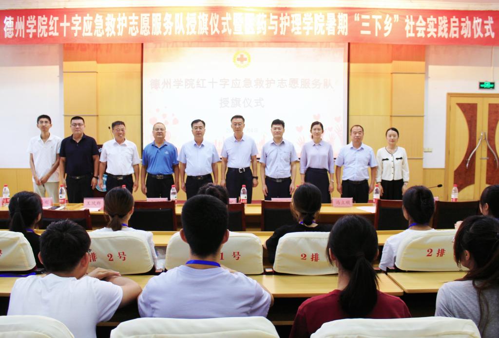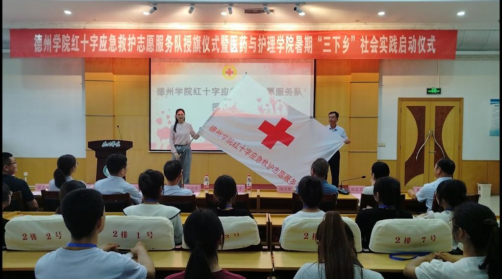 为弘扬“人道、博爱、奉献”的红十字精神和“奉献、友爱、互助、进步”的志愿服务精神,更好地推进暑期“三下乡”社会实践活动深入开展。7月6日下午,医药与护理学院于厚德楼四楼报告厅举办Beat365唯一官方网站红十字应急救护志愿服务队授旗仪式暨暑期“三下乡”社会实践启动仪式。Beat365唯一官方网站党委委员、副校长迟沂军、德州市红十字会常务副会长李福辉、德州市红十字会党组成员、副会长黄卫东出席,校团委、医药与护理学院相关负责人、市红十字会应急救护培训中心相关负责人及学生志愿者共百余人参加。