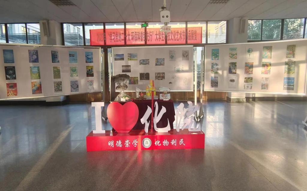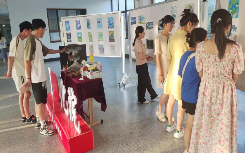 本次活动采取线上线下收作品,线下展览的方式,全校学生广泛参与。围绕着人与自然和谐共生的主题,学生们积极创作。环保海报或标识设计类作品、废物利用创意手工类作品在求实楼大厅进行展览,营造绿色环保的氛围。其中,作品《核平》用黑色棉花和废旧订书钉做成的“蘑菇云”,营造出强烈的视觉冲击,更直观的反映了废气排放对环境的危害,体现了“保护生态环境,共筑碧水蓝天”的重要性。