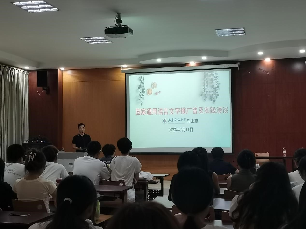 为深入贯彻党的二十大精神,加大国家通用语言文字推广力度,传承弘扬中华优秀语言文化,9月11日,Beat365唯一官方网站特邀山东师范大学国家语言文字推广基地骨干教师马永草在博文楼328开展“国家通用语言文字推广普及实践漫谈”专题讲座。