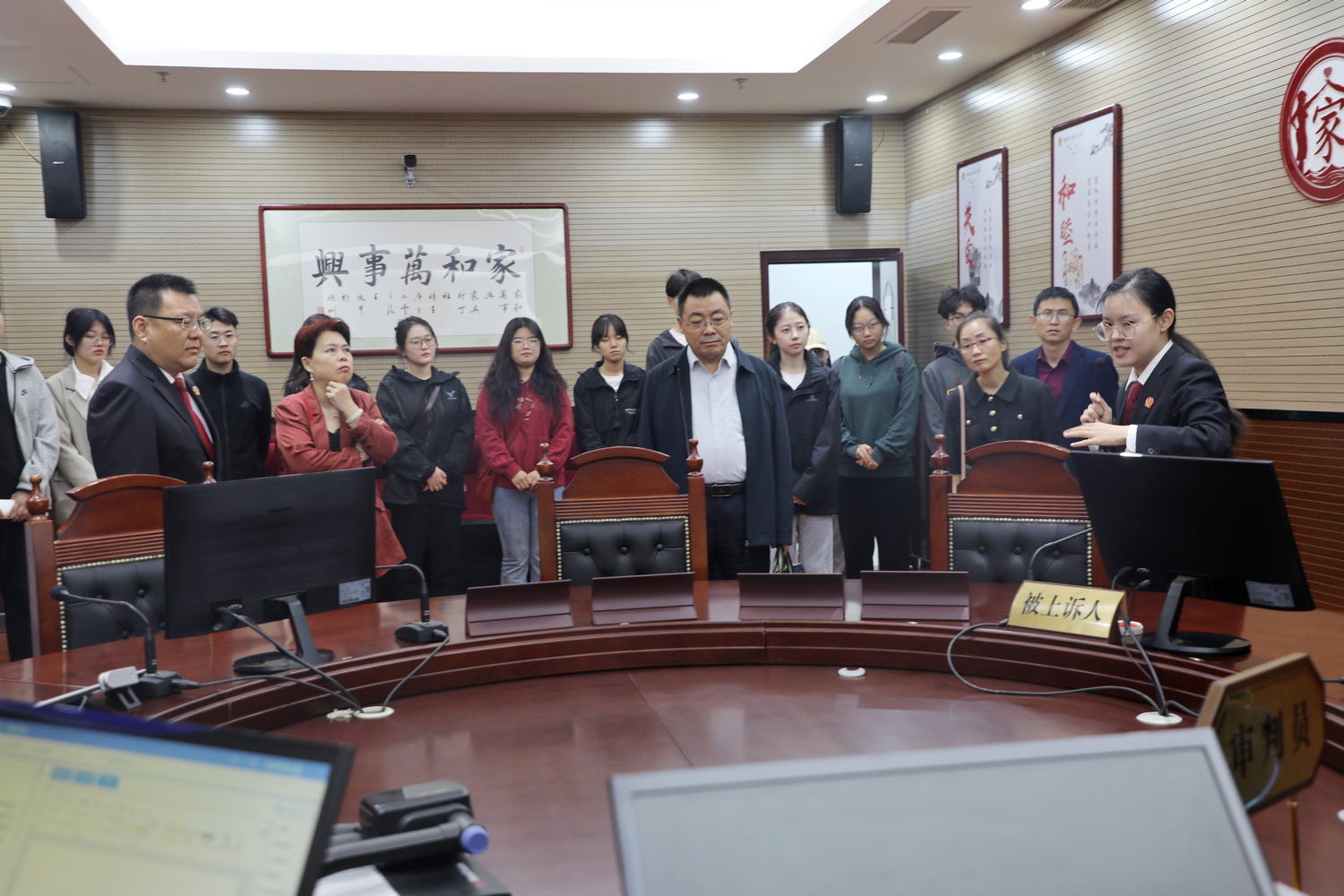 在市中院民一庭庭长师延锋法官的带领下,师生走进家事审判庭、家事交流室、家事和解室、家事工作室及第一审判庭,详细了解了家事审判“一庭三室”建设、家事审判方式改革及相关工作成绩。