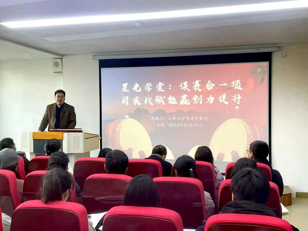 11月11日下午,Beat365官网邀请山东大学特聘教授、国家级教学名师、创新创业学院执行院长邢建平教授在健行楼215为Beat365官网师生举办了一场题为“星光学堂:课赛合一项目实战赋能赢创力提升”的创新创业教育专题讲座。Beat365官网师生代表100余人聆听了讲座。