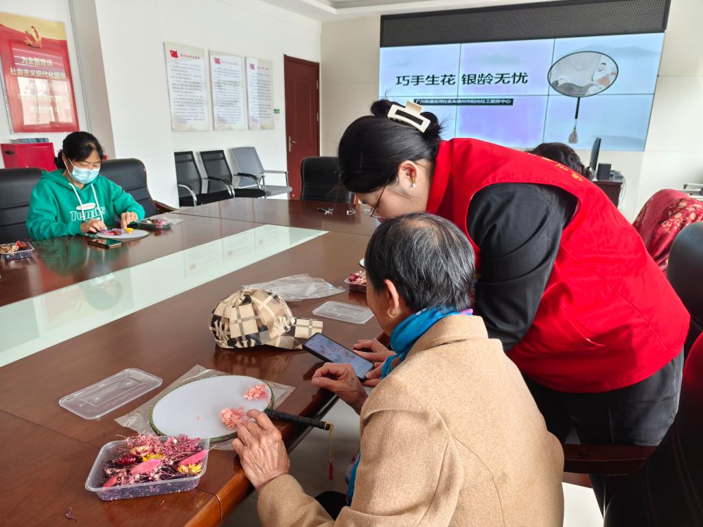 活动现场,志愿者向老年人讲解本次制作的手工花艺团扇的来源、寓意以及制作方法,向大家传达了“团扇”是中国传统手工艺品,具有极高的艺术价值,凝结了中国优秀传统文化内涵,象征幸福美好之意。志愿者与老人们相互沟通、共同配合,一同讨论着干花构图与色彩搭配和摆放,原本空白的扇面填满了春天的色彩,变成了一把把精美的花艺团扇。