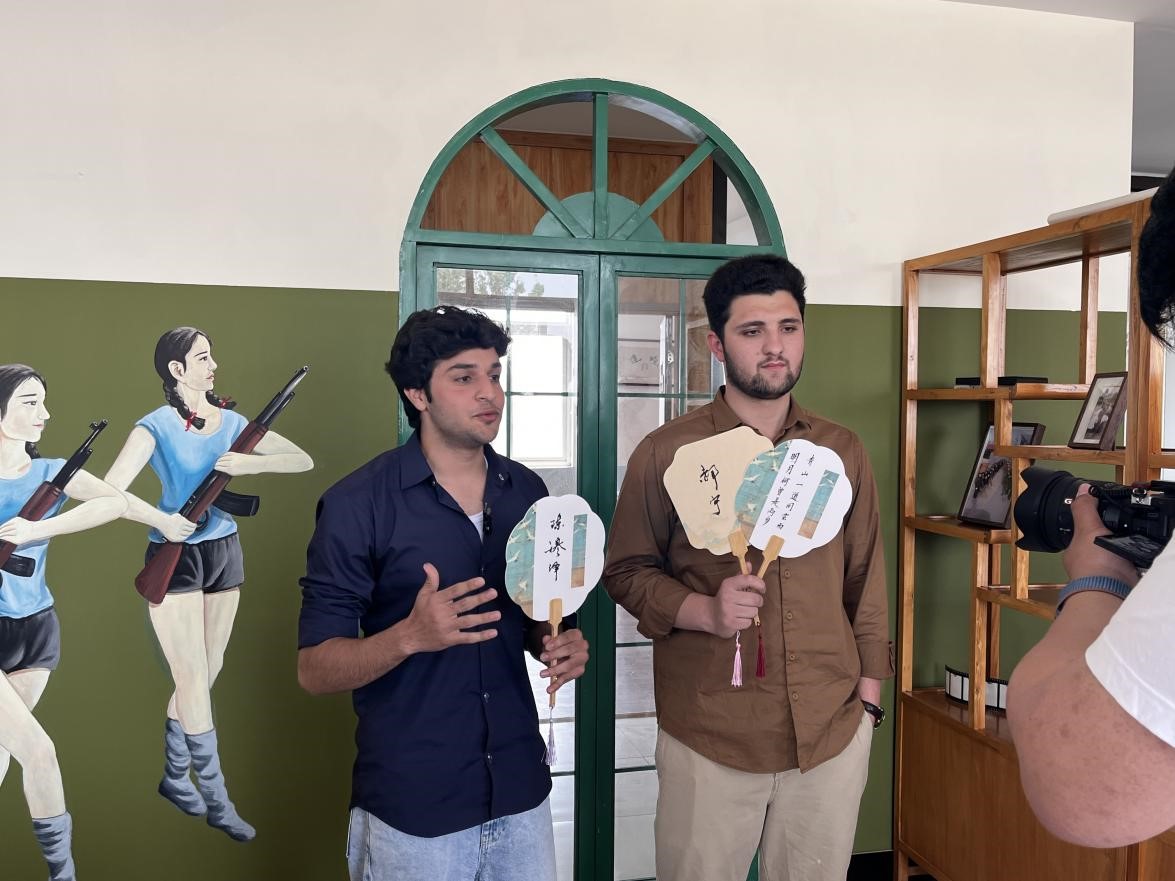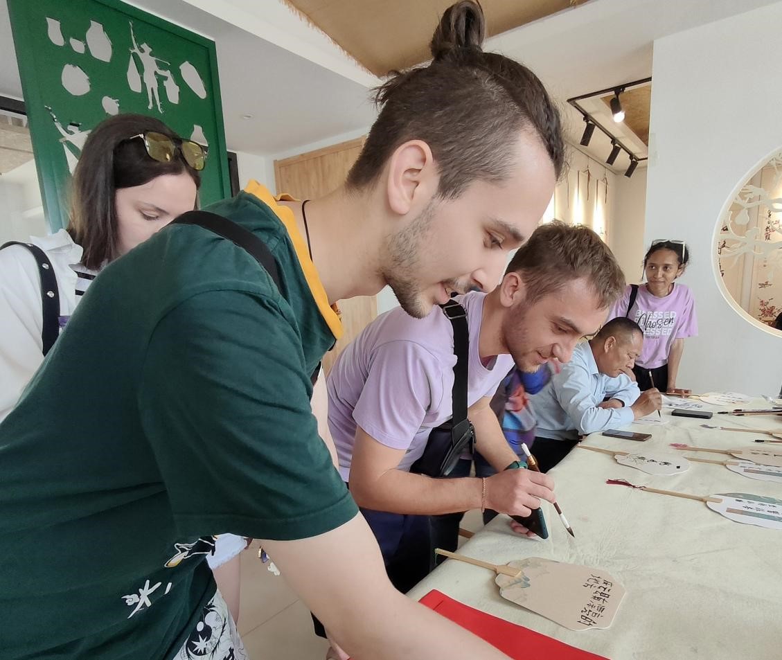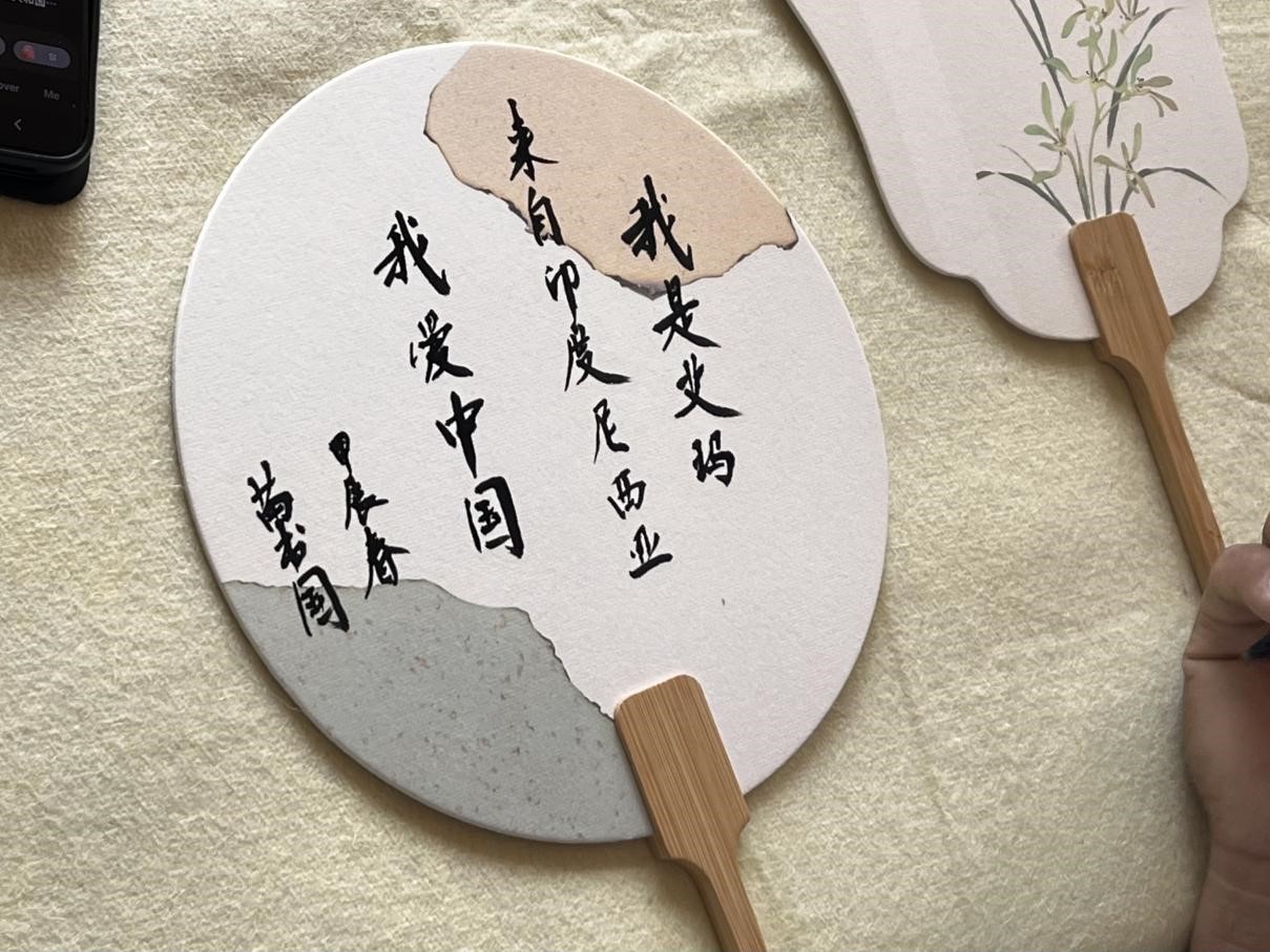 接下来,留学生们来到了中丁乡文化馆。在这里,同学们欣赏到了非物质文化遗产—核雕技艺。小小果核在匠人手中亦能变为精美的艺术品,这让同学们惊叹不已。在几位当地书法爱好者的亲切指导下,同学们还尝试了扇面书法,在扇面上写下了自己的名字,如获至宝,表示这对于他们而言是一份精美且意义非凡的礼物。