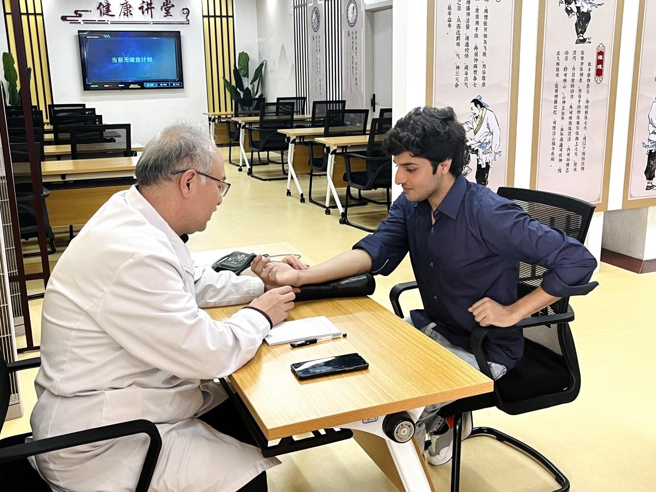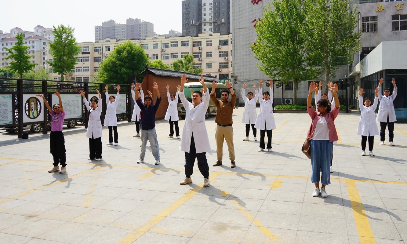 在各位医师的带领下,留学生首次体验了中华传统健身功法—八段锦,同学们认真学习着一招一式,一套练习过后,大家纷纷表示感觉肌肉舒展、精神放松、充满活力。