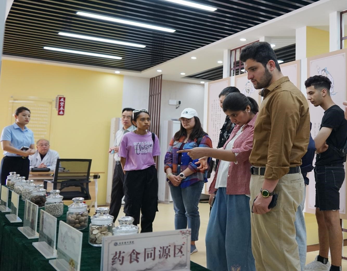 此行第一站,同学们来到了庆云县中医院参观中医文化馆。在这里,留学生们被古色古香的展厅环境深深吸引,在讲解员的引导下,同学们更加详细地了解到了我国中医药的历史发展渊源以及历代杰出医药学家的重大成果。文化馆内展出的各类中药标本吸引着同学们驻足观看,认真听取讲解,对于各类中药用途之繁多,中医疗法功效之全面不由得发出赞叹。