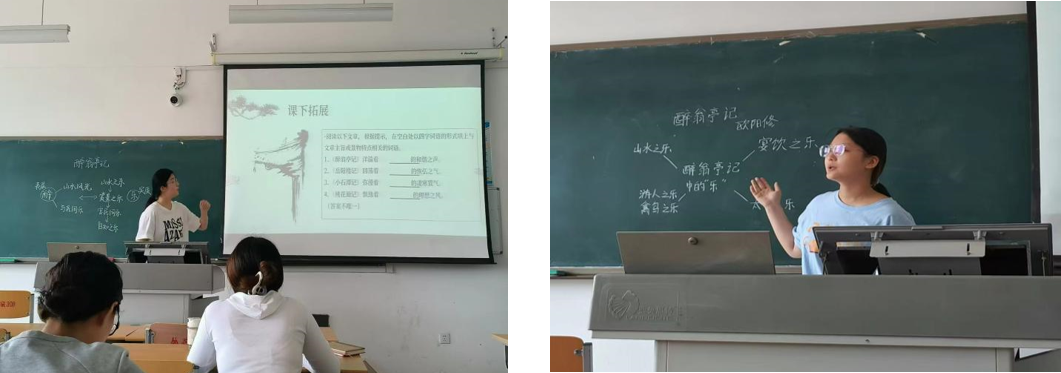 第二阶段,见习学生共分为13组进行教育模拟试讲,分别由13位校内教师负责,同时部分教育实习基地教师参与指导。学生见习篇目涉及古诗文《岳阳楼记》、《醉翁亭记》、《行路难》,现代诗歌《沁园春·长沙》、《祖国呀,我亲爱的祖国》以及现代散文《紫藤萝瀑布》等,学生们与指导教师不断打磨说课稿、讲课稿,精益求精,反复练习。这一阶段,学生将所学的基础理论、基本知识和基本技能,进行教学设计,并模拟试讲,初步形成从事中学语文教育工作的基本能力。