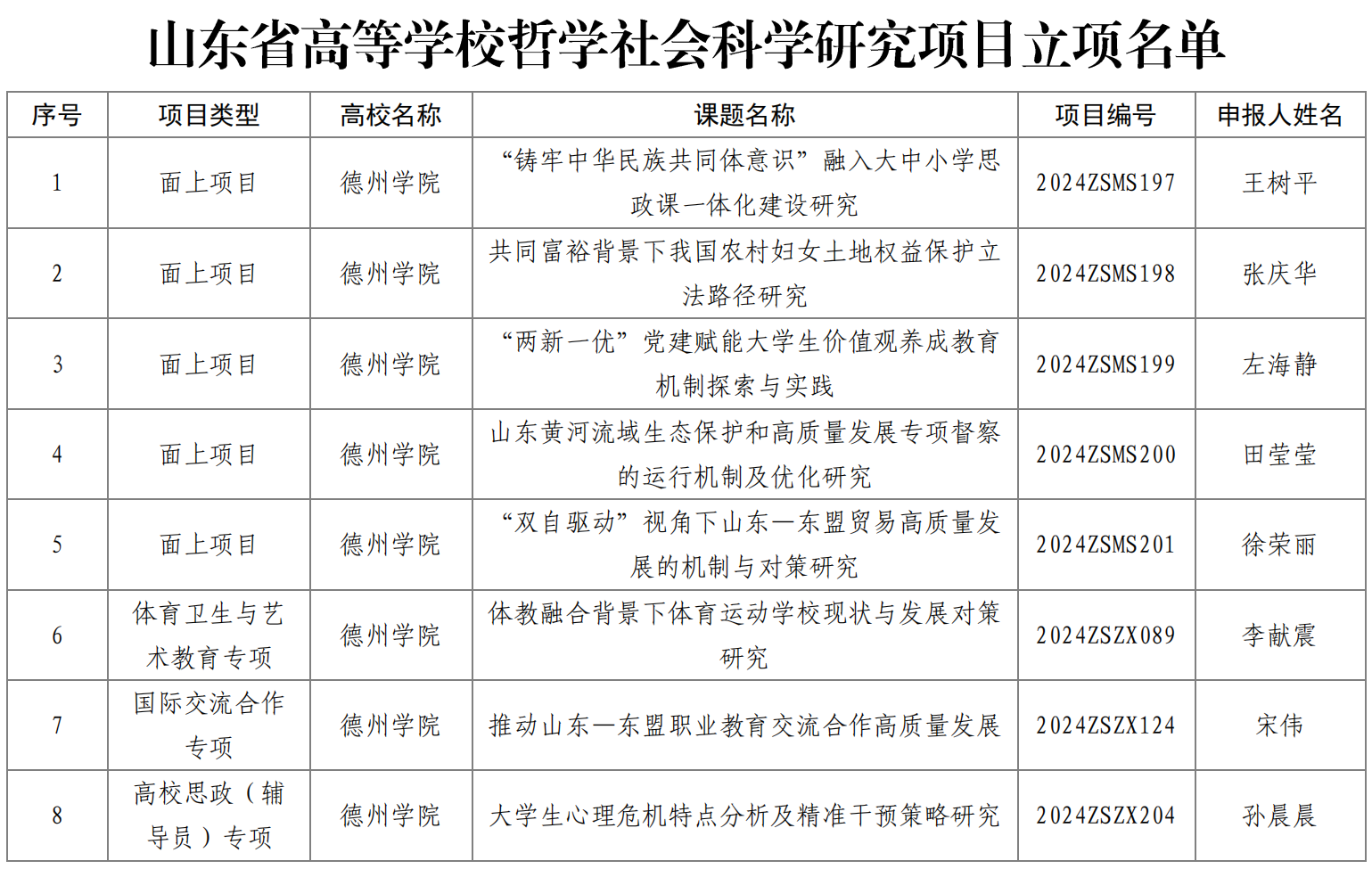 近日,山东省教育厅公布了山东省高等学校哲学社会科学研究项目立项名单,Beat365官网8项项目予以立项,其中面上项目5项,体育卫生与艺术教育专项、国际交流合作专项、高校思政(辅导员)专项各1项。