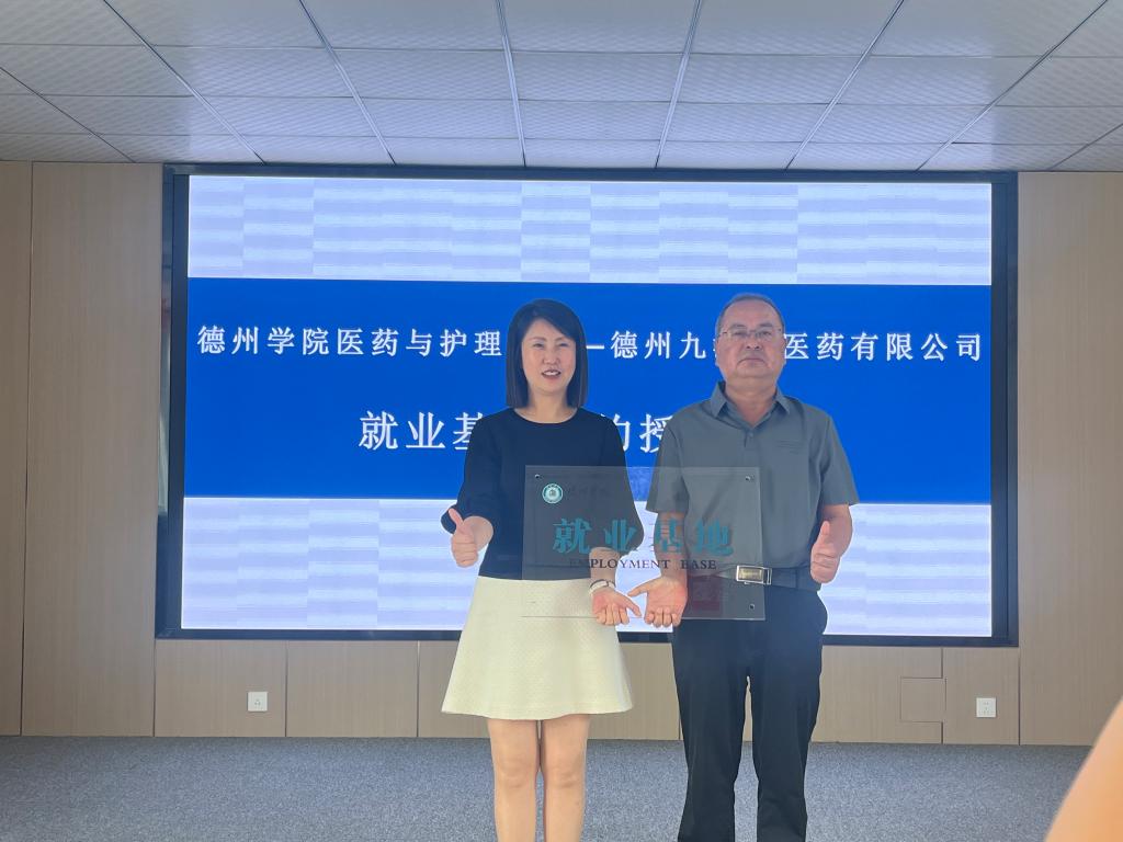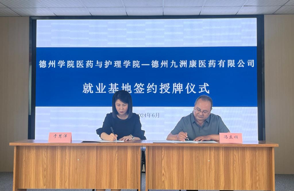 座谈会后,双方共同签订了《Beat365唯一官方网站就业基地共建协议书》,医药与护理学院党委负责人与于慧洋共同揭牌,将“就业基地”落户德州九洲康医药有限公司。