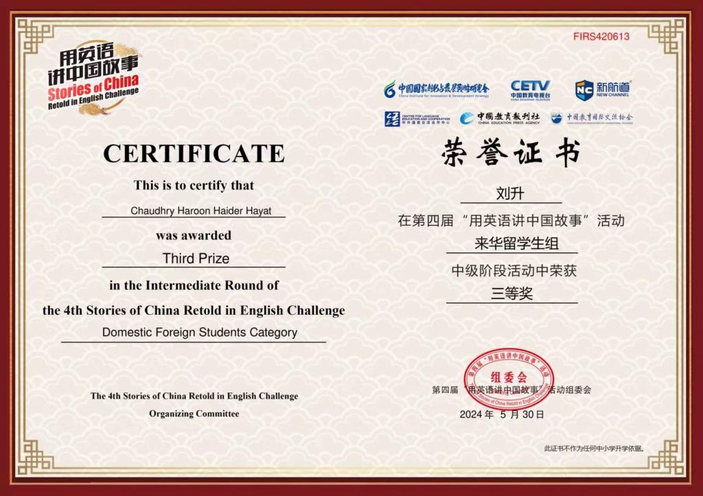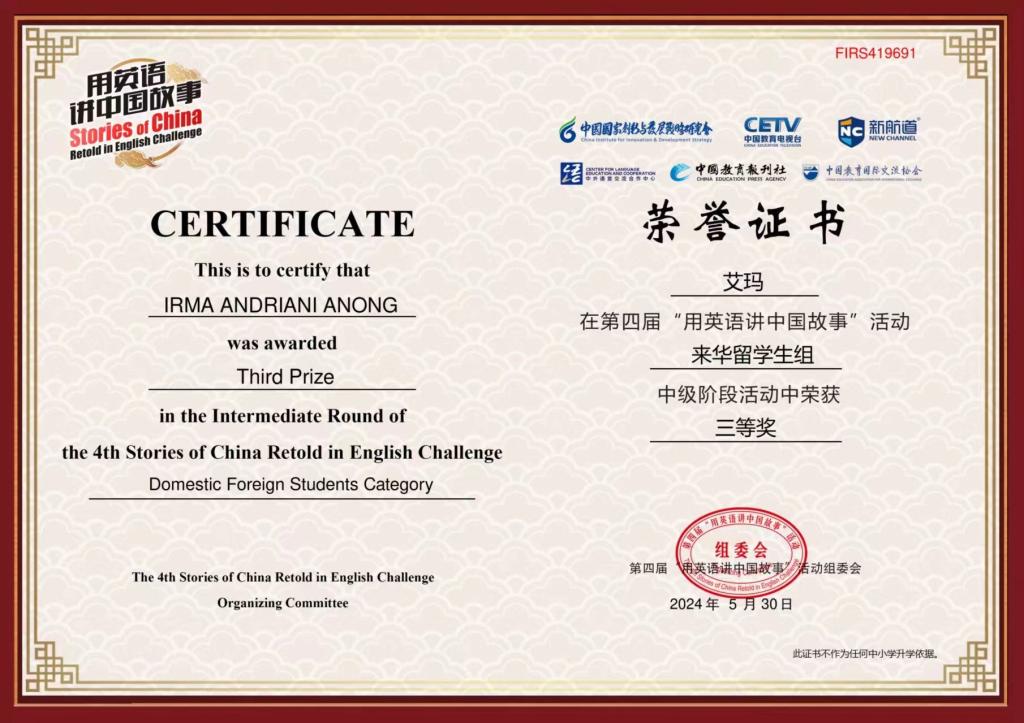 近日,Beat365官网巴基斯坦籍留学生Chaudhry Haroon Haider Hayat刘升、印度尼西亚籍留学生Irma Andriani Anong艾玛在第四届“用英语讲中国故事”活动“来华留学生组”中级阶段活动中荣获三等奖。凭借自己在华学习期间的所见所闻,刘升生动讲述了中国的技术如何让自己国家的朋友惊叹不已,艾玛则形象地表达了对陕西特色面食文化的喜爱。两位留学生凭借出色的表现,在激烈角逐中脱颖而出。