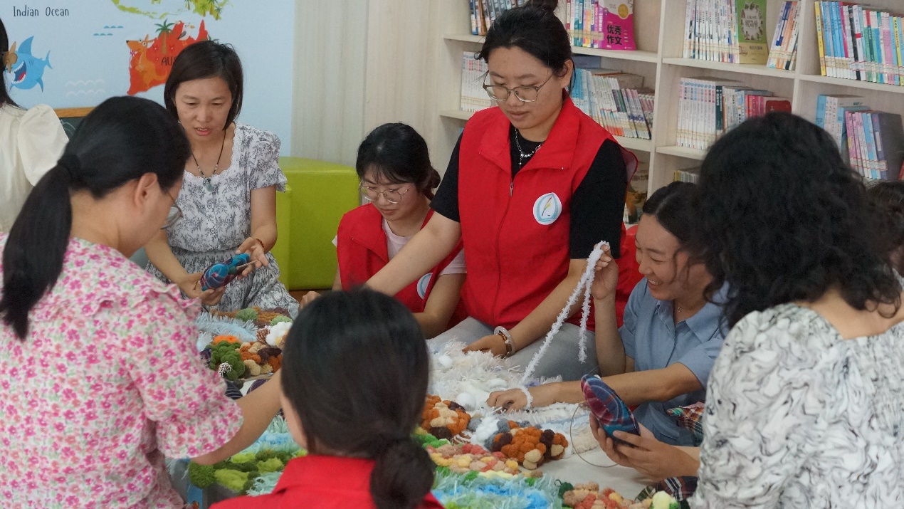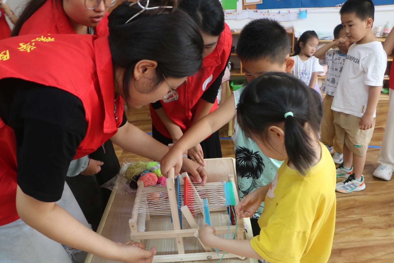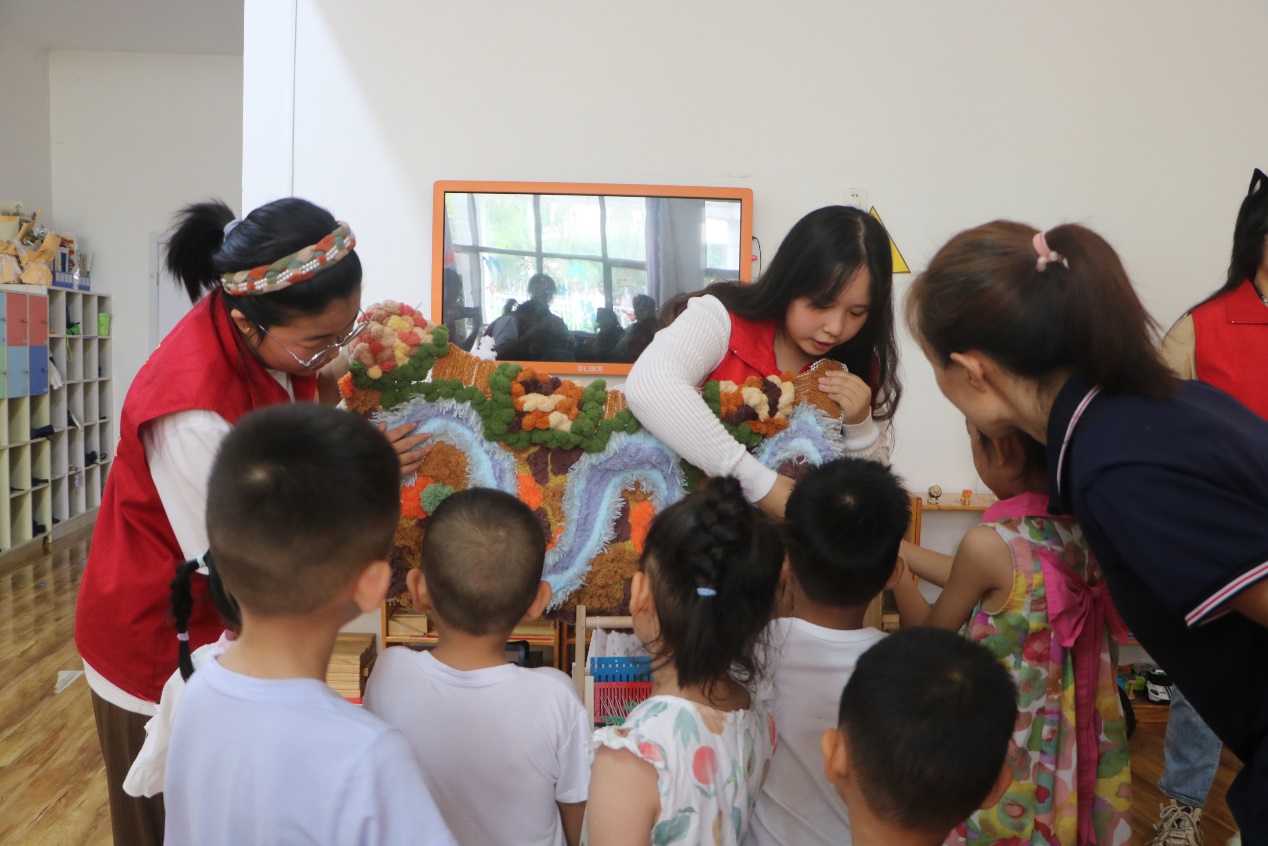 7月12日,志愿服务团带着展现古运河风情的纤维艺术挂毯与彰显传统文化魅力的鲁锦艺术挂件,走进了德州市德城区美林幼儿园,为孩子们带来了一场别开生面的运河文化盛宴。通过运河文化主题漆扇制作、纤维艺术挂毯体验以及小型织布机上的鲁锦纹样编织等活动,孩子们在动手实践中感受到了运河文化的博大精深与鲁锦技艺的独特魅力。团队成员耐心讲解,与孩子们亲密互动,不仅激发了他们对传统文化的兴趣与热爱,更在他们心中种下了文化传承的种子。