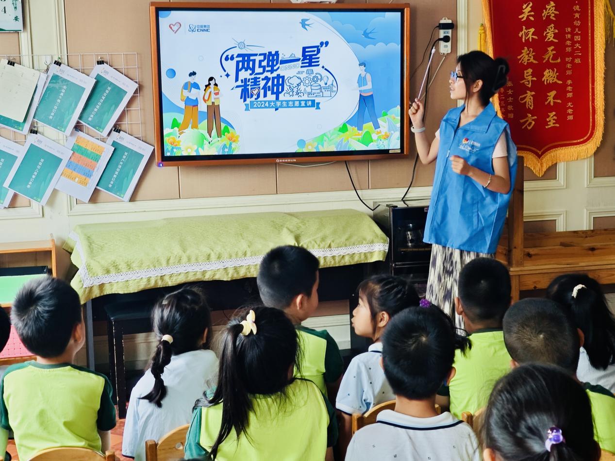 7月10日,“薪火”宣讲团走进德育幼儿园,讲解团以“两弹一星”的动画视频开场,向小朋友们以趣味性的方式说明“两弹一星”的含义,向小朋友们介绍了“两弹一星”的功勋人物和历史成就,利用教具同小朋友们以游戏的方式调动积极性。游戏过程中,讲解员向小朋友们提出相关问题,小朋友们踊跃举手抢答,脸上洋溢着对知识的渴望和对英雄的崇敬。