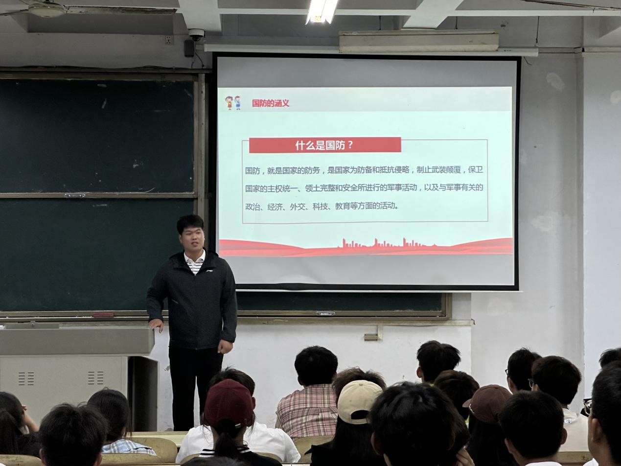 邢康结合自己的军旅生涯,以“心系国防、有你有我”为主题,围绕国防的含义、我国现代化国防建设、公民的国防义务等方面内容展开宣讲。他指出,兵役义务是公民最重要的一项国防义务,强大的国防是国家民族生存和发展的基本条件,要清楚地认识到当下我们的国家形势和国际环境,社会发展安定、人民生活幸福得益于祖国强大的国防建设。他通过介绍我国的基本国防情况,用导弹护卫舰、驱逐舰、潜水艇和登陆艇案例讲述我国现代化国防建设,让同学们明白了人民军队的现代化建设提高了中国国防的总体实力和防卫作战能力,为保卫祖国的领土完整和国家统一筑起了一道坚固的铁长城。最后他号召同学们要把个人发展与国家、社会发展紧密联系起来,进一步凝聚关心国防、热爱国防、支持国防、建设国防的思想共识,用奋斗擦亮青春亮丽底色,为实现中华民族伟大复兴贡献青春力量。