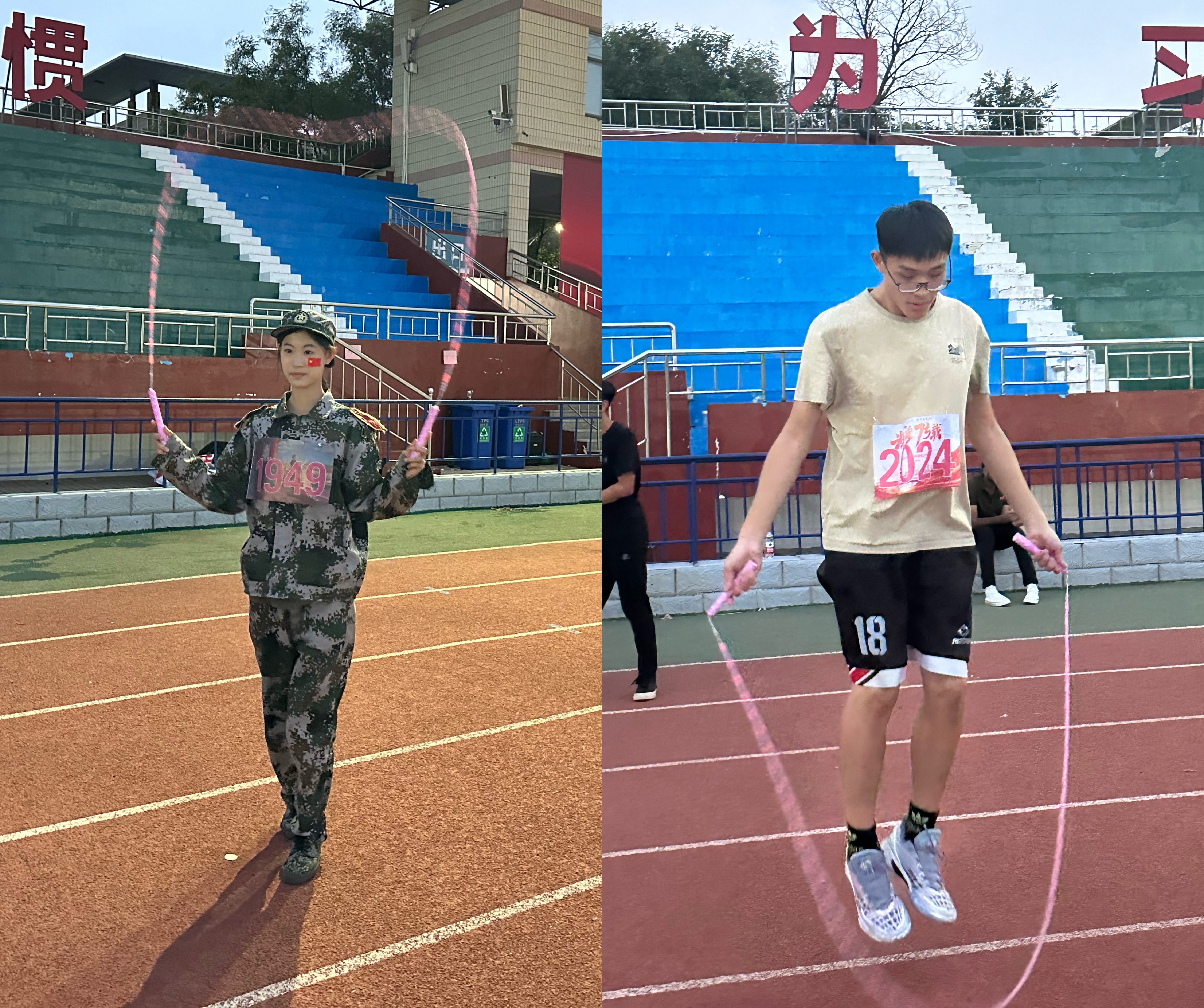 “红色接力”跳绳比赛同样扣人心弦。各学院的队员依次登场,每人在30 秒的时间内,全情投入,跳绳飞舞。活动以1949年到2024年重大历史事件的主要年份作为号码薄,以重大事件图片作为背景,让同学们在跃动中回忆新中国史,感受国家发展的波澜壮阔。