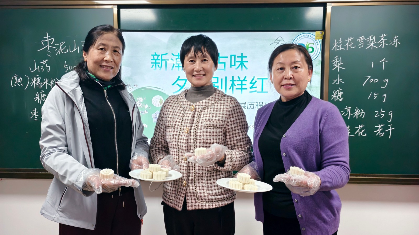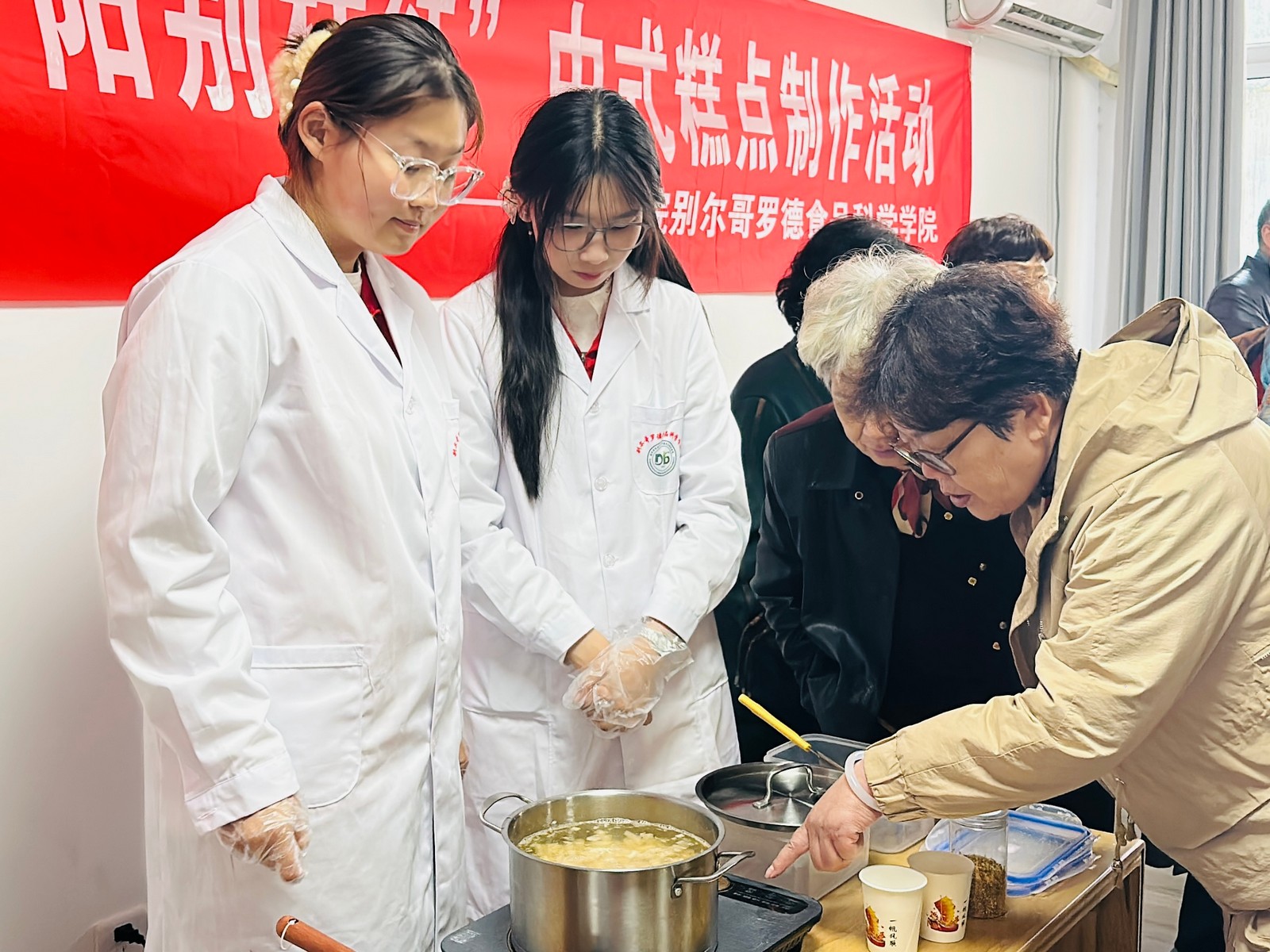 学校大学生营养膳食协会的志愿者首先向长辈们讲解了中国传统糕点的历史背景和发展前景,并讲解了传统美食背后的制作工艺,通过实例介绍了各地区有关糕点的风俗。重点讲解《红楼梦》中的特色糕点—枣泥山药糕的功效、制作流程,准备好物料和相关食材后,志愿者们开展带领老年大学的长辈们复刻枣泥山药糕,在制作过程中,志愿者们耐心讲解每一步的要点与技巧,老年大学的长辈们则聚精会神地学习,自己动手操作的同时并不时提出问题,深刻体会到了中式糕点制作工艺的复杂性和精细性,也更加深入理解了药食同源的理念在传统美食中的应用。随后,志愿者们又介绍了创新型中式糕点桂花雪梨茶冻的制作方法,同样先给长辈们讲解茶冻的功效、制作工艺,紧接着与大家一起亲手制作茶冻。最后,长辈们品尝着自己制作的枣泥山药糕和桂花雪梨茶冻,幸福满足之情溢于言表。纷纷表示不仅体验到了中式糕点的独特魅力与深厚文化底蕴,还学会了糕点的制作方法,对中华传统饮食文化有了更深的了解。