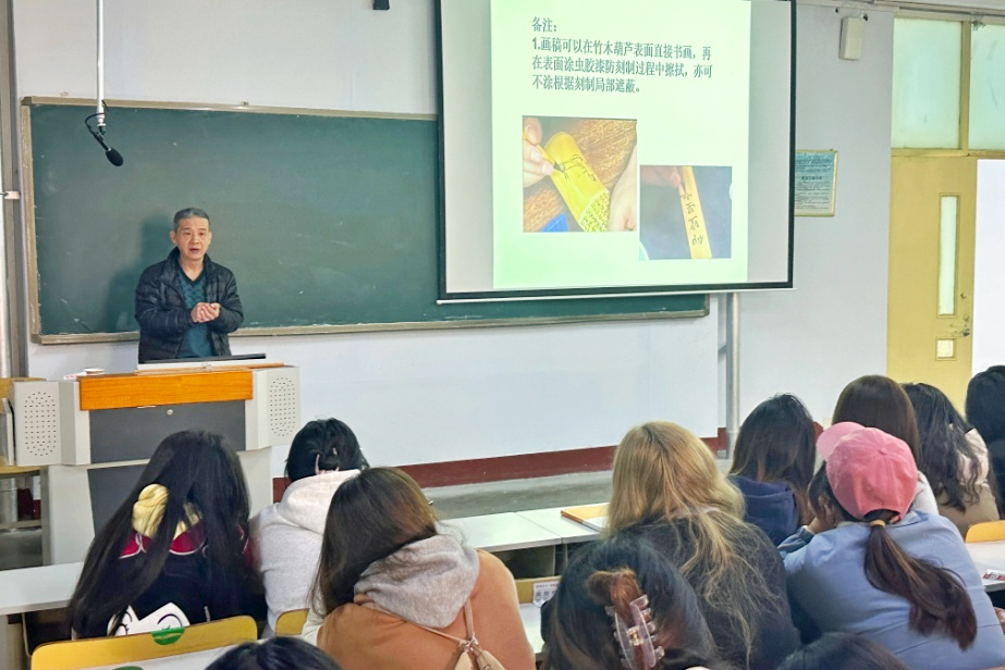 为发挥非遗传承在以文化人、以美育人中的重要作用,让学生了解优秀传统文化,体悟匠心精神,美术学院特邀省级非遗代表性项目木刻刀笔书画代表性传承人唐万武先生为师生举办了专题讲座、体验课。