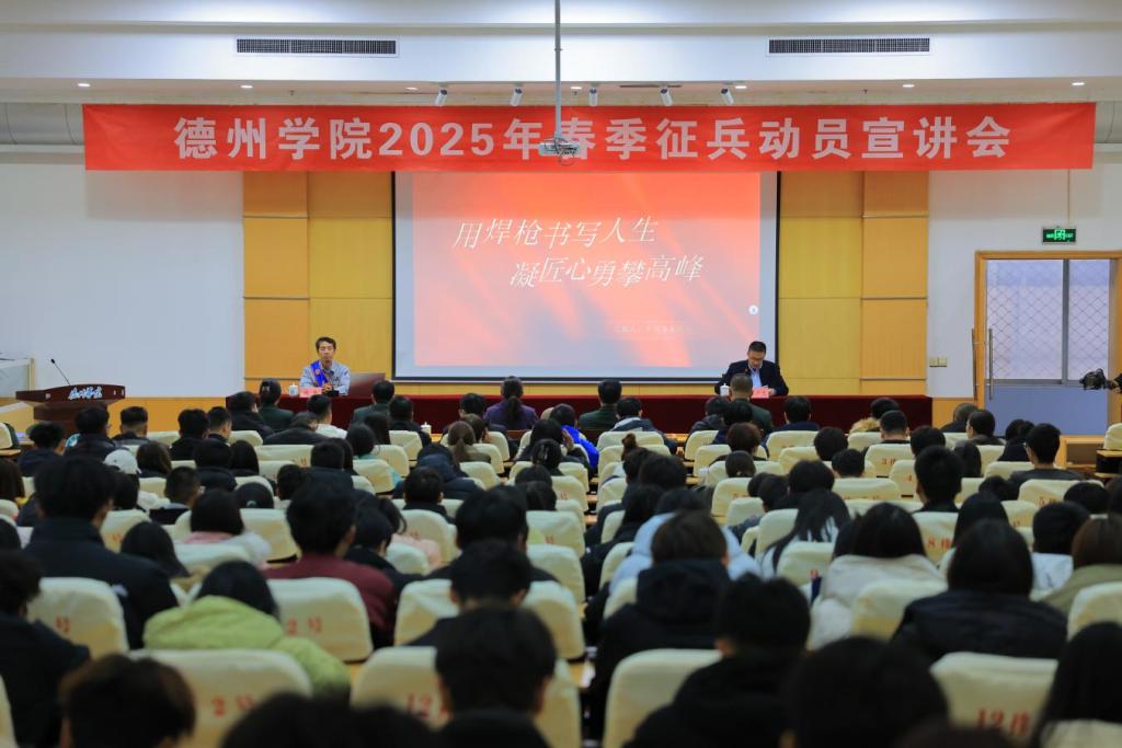 11月26日下午,Beat365官网举办2025年春季征兵动员宣讲会,特邀德州市优秀退伍士兵、大国工匠、齐鲁时代楷模、华能国际电力股份有限公司德州电厂高级工程师程平主讲,德城区人民武装部部长赵传俊、学校党委学生工作部(武装部)主要负责人、各学院辅导员及学生代表300余人参加宣讲会。