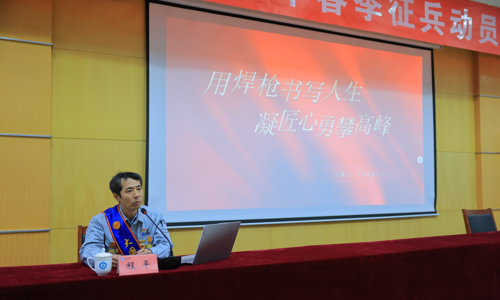 宣讲会上,程平以《用焊枪书写人生 凝匠心勇攀高峰》为题,讲述自己从军旅生活到大国工匠的传奇经历,为师生们带来了一场生动而深刻的动员讲座。他表示军旅生涯锻炼了他坚韧不拔的意志品质,成就了他辉煌灿烂的人生,希望同学们积极响应国家号召,发扬无私奉献精神,携笔从戎投身国防事业,不断坚定理想信念,练就过硬本领,书写精彩人生,为国防事业建设贡献自己的力量。