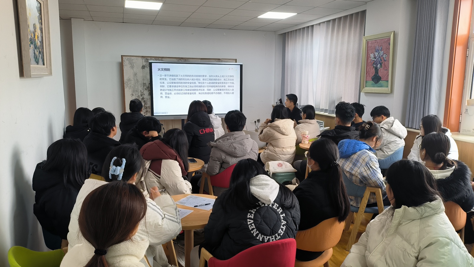 本次活动由法学与公共管理学院崔建老师担任主讲人。崔建结合近期发生在校园内外的典型火灾案例,深入浅出地对消防法进行了解读。然后从火灾预防、消防组织、灭火救援、法律责任等方面,全方位地向学生们普及了消防法核心要点,让大家深刻认识到消防法不仅仅是一部法律条文,更是保障生命财产安全的有力武器。在互动环节中,学生们积极提问,就日常学习生活中遇到的消防安全问题进行了深入探讨交流,并提醒学生们要时刻保持警惕,遵守消防法律法规,杜绝各类火灾隐患的发生。