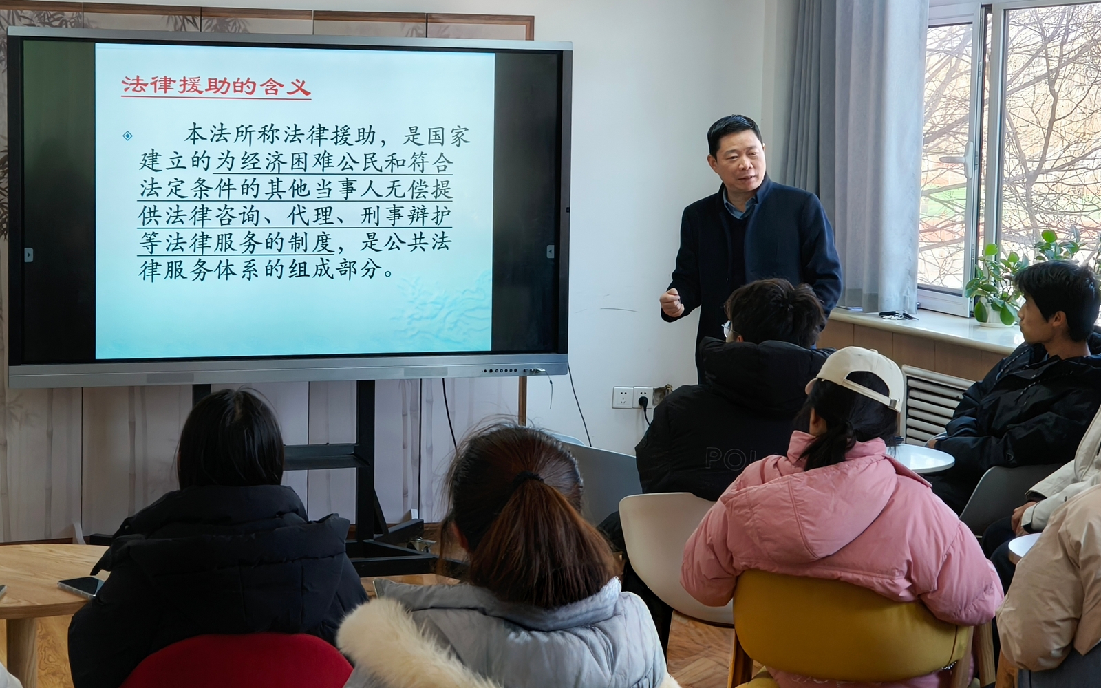 本次活动由法学与公共管理学院王海鹏老师担任主讲人。王海鹏分别从法律援助法的含义、目的、形式和原则等多个方面对《中华人民共和国法律援助法》进行了细致讲解,并以生动鲜活的案例为切入点,解读法律援助法的应用场景。在交流环节,同学们踊跃举手提问,王老师一一耐心解答,用精准的法律分析和实用建议赢得阵阵掌声,现场气氛热烈而活跃。