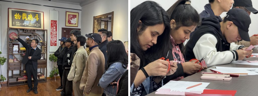 在德州建志剪纸博物馆,非遗传承人张建志现场演示了剪纸技艺的精妙技法,从折叠、勾画到裁剪,一张红纸在他手中化作栩栩如生的花鸟图案。留学生们在指导下成功剪出了象征着春暖花开的剪纸作品。留学生永明表示:“剪纸像魔法一样神奇!我要把这张‘春’字贴在自己房间,把中国的好运带回家。”