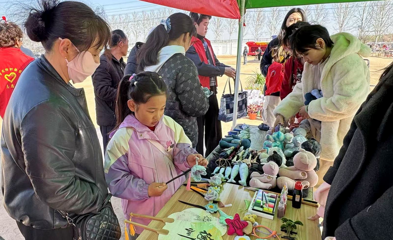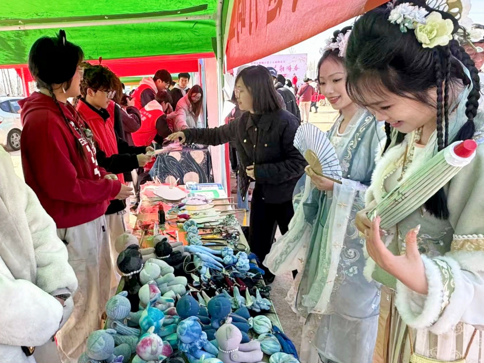 活动现场,学生志愿者精心布置的摊位成为桃园里的一道独特风景。融合鲁锦非遗元素的香囊、色彩斑斓的扎染小熊玩偶、灵动可爱的扭扭棒发卡、精致的编绳皮筋等手工艺品琳琅满目,吸引众多游客驻足挑选。同学们热情地向顾客介绍每件作品的设计理念——鲁锦香囊的纹样取自黄河涯桃林的花瓣轮廓,扎染小熊的配色灵感源于春日桃枝与绿叶的自然碰撞,扭扭棒发卡则以桃花造型呼应花朝节主题。细腻的工艺与巧妙的构思赢得游客称赞。