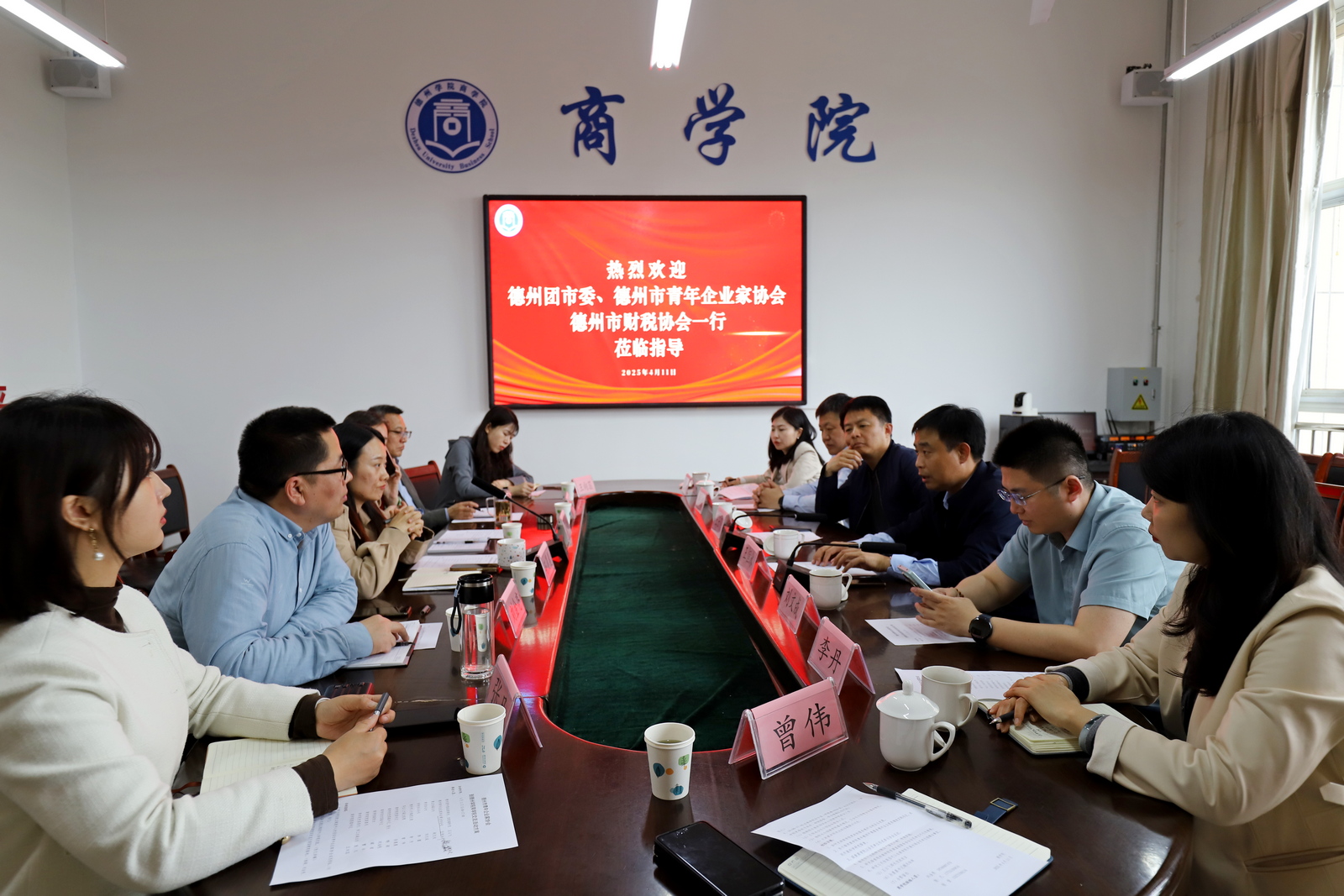 为推动校企深度合作,促进人才培养与地方经济发展有机融合,探索产学研深度融合的创新路径。4月11日,德州团市委统战部部长王云飞、市青年企业家协会会长王恒冰、市财税协会会长李蕾等一行来访商学院。