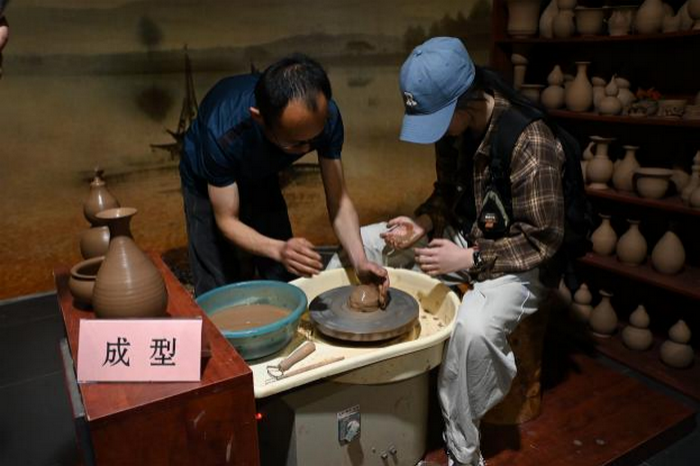 在德州市博物馆,教师引导学生系统梳理了德州从大汶口文化到近代的文明发展史,尤其关注黑陶在龙山文化中的鼎盛地位。在中国黑陶城博物馆,了解黑陶从新石器时代大汶口文化、龙山文化至今的发展历程。德州黑陶以京杭大运河两岸特有的红胶泥为原料,经手工轮制、雕刻、高温烧制及渗碳工艺,最终形成“黑如漆、亮如镜、薄如纸、声如磬”的艺术效果。展馆内陈列的蛋壳黑陶高柄杯、浮雕黑陶瓶等精品。学生现场学习了拉坯、雕刻等关键工序,并就黑陶的现代应用与博物馆负责人进行了交流。