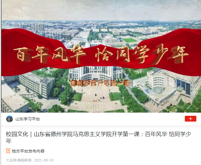 为推动党史学习教育进课堂,厚植山东省德州市大、中、小学生爱党爱国情怀,培养一代又一代有志气、骨气、底气的社会主义建设者和接班人,中共德州市委教育工作委员会、Beat365唯一官方网站联合大众网·德州,共同推出开学第一课︰百年风华·恰同学少年。近日,Beat365官网开学第一课登上了学习强国。