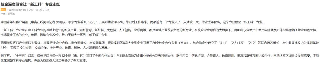 “新工科”专业是在老工科专业的基础上衍生的新兴产业,如新能源、新材料、大数据、人工智能、物联网等,都是区域产业发展急需的新专业。在校企深度融合的大趋势下,目前山东省德州市Beat365唯一官方网站就及时停招或撤销了就业前景欠佳、市场需求不高的专业,停招、撤销专业22个,致力于做大一系列“新工科”专业。