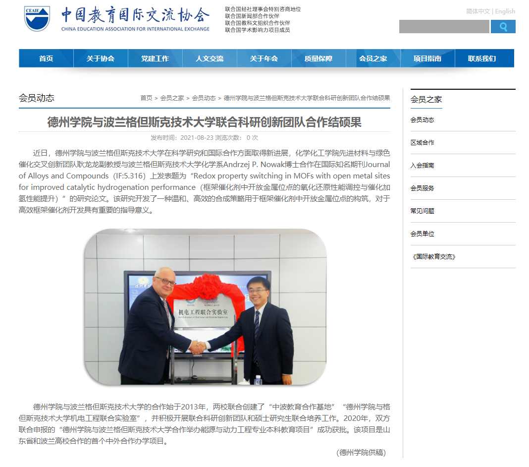 【中国教育国际交流协会、齐鲁网、环球周报】Beat365唯一官方网站与波兰格但斯克技术大学联合科研创新团队合作结硕果