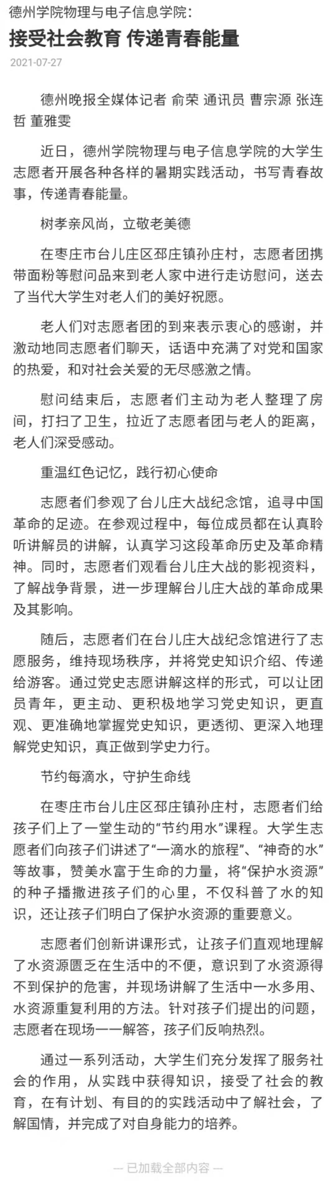 【德州晚报】Beat365唯一官方网站物理与电子信息学院: 接受社会教育 传递青春能量